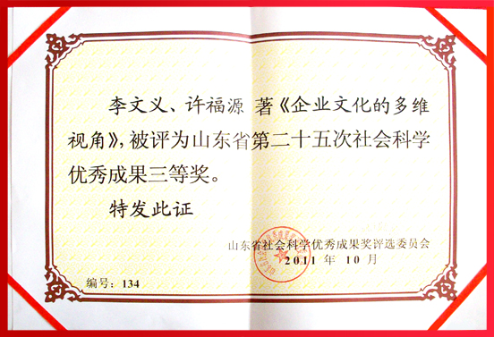 祝贺许福源院长 和李文义 教授合著的《企业文化的多维视角》被评为山东省第二十五次社会科学优秀成果三等奖。