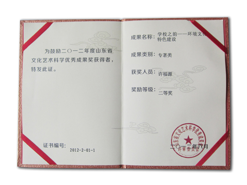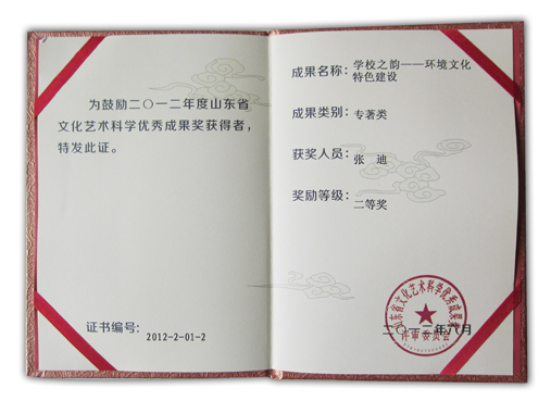 热烈祝贺我院编撰出版的《学校之韵——环境文化特色建设》 荣获“山东省文化艺术科学优秀成果”二等奖