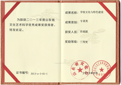 热烈祝贺《学校文化与特色建设》被评为山东省文化艺术科学优秀成果三等奖