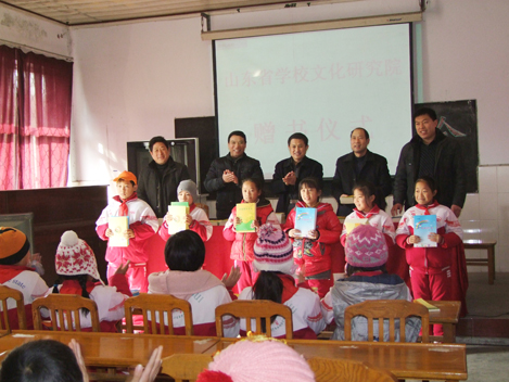 12 月 12 日 ,山东省学校文化研究院向沂南县大王镇明德小学捐赠了安全教育、孝德教育、国学教育系列图书,并举行了图书捐赠仪式。研究院许福源院长、沂南县教体局徐兴晨副局长、沂南县教体局普教科代恩江科长出席仪式并向学生们授书。